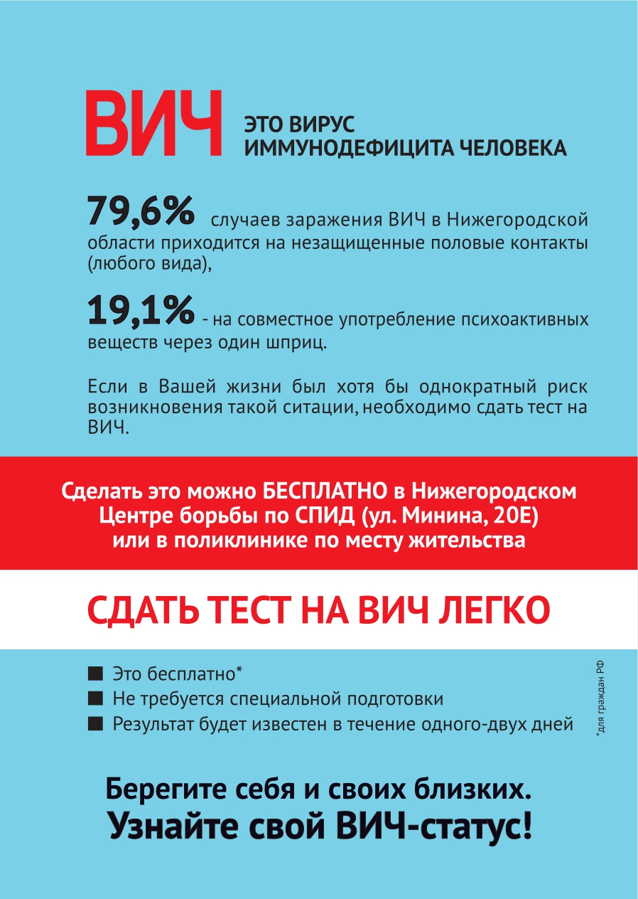 Все граждане РФ имеют право БЕСПЛАТНО пройти тест на ВИЧ в любом государственном учреждении здравоохранения по месту жительства или Центрах профилактики и борьбы со СПИДом.